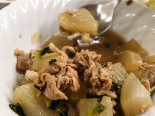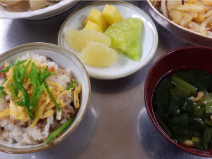 炊き込みご飯/豚汁/大根菜と豚肉の炒め物/大根と鶏肉の煮物/柿